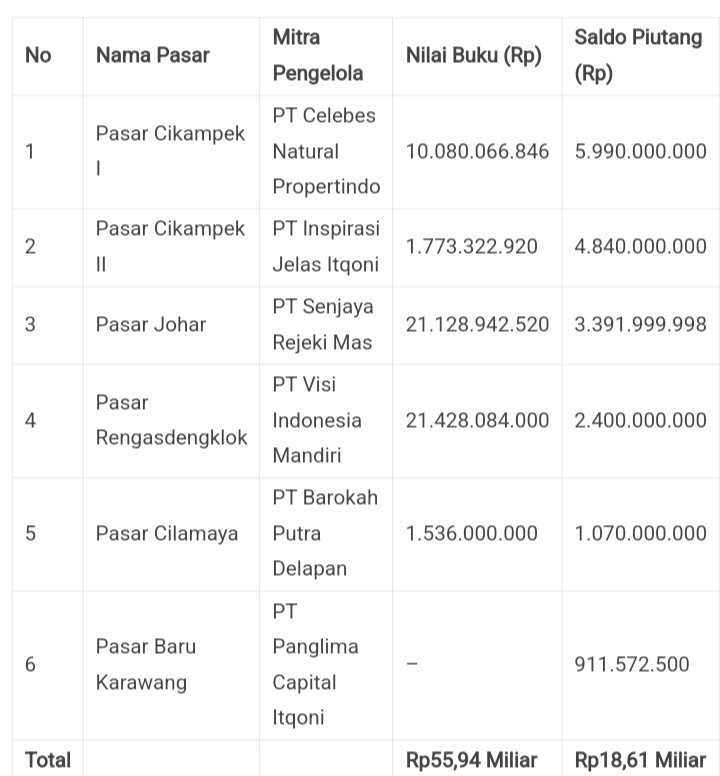 BPK mencatat, enam pasar tersebut dikelola pihak ketiga melalui skema Bangun Guna Serah (BGS) dengan total nilai aset Rp55,94 miliar. Namun, sebagian besar mitra pengelola tidak memenuhi kewajiban penyetoran kontribusi ke kas daerah.