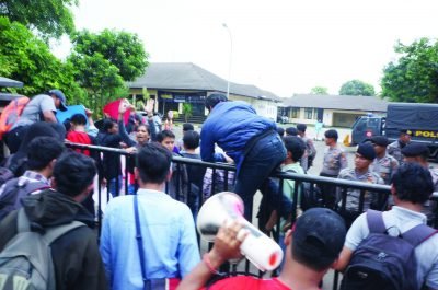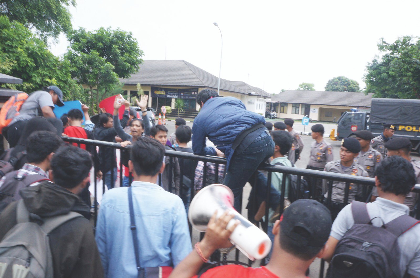 Setelah sempat tertahan di pintu gerbang kantor Kejari, puluhan massa akhirnya melompat pagar memasuki halaman kejaksaan. Selain berorasi, Kaukus Rakyat Karawang juga membubuhkan cap jempol darah di spanduk.