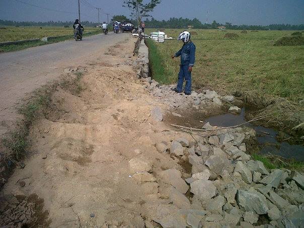 Turap penahan jalan yang baru saja tuntas dibangun oleh CV Srikandi kini ambruk sepanjang  kurang lebih 7 meter, patah, dan menutupi saluran air.