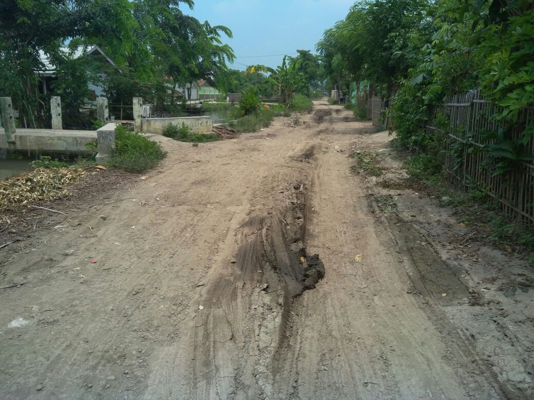 Puluhan tahun belum terjamah perbaikan, jalan alternatif Dusun Karangmulya Desa Medankarya yang menghubungkan Kecamatan Tirtajaya dan Batujaya Kabupaten Karawang, kondisinya sangat memprihatinkan seperti kubangan kerbau.