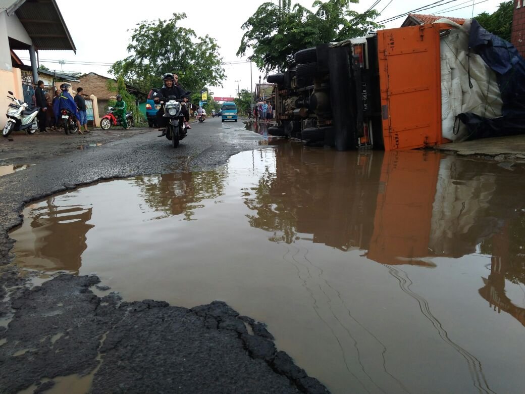 “Baru kali ini saya kecelakaan. Sekarang jalan di Cilamaya banyak lubangnya. Mulai dari Rawagempol Kulon sampai Krasak. Saya kira lubang jalan tidak terlalu dalam, ternyata ban kanan truk yang saya kemudikan sampai terperosok, dalem banget,” katanya.